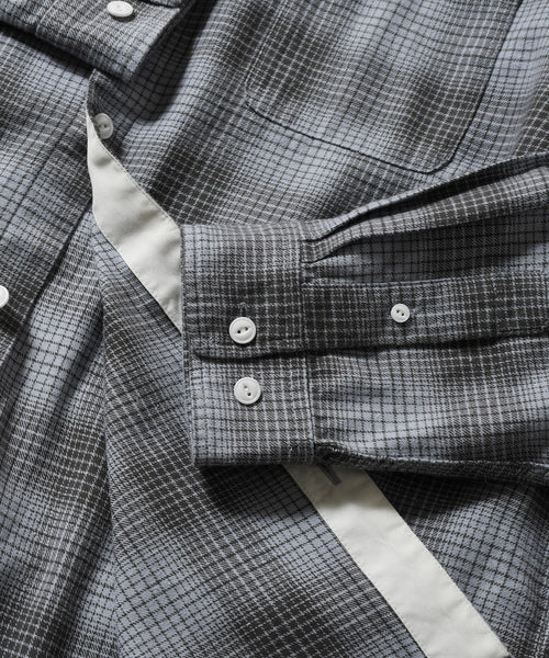 クラシックなチェックパターンと洗練されたバンドカラーが絶妙に調和し、上品さと無骨さを兼ね備えた一枚。